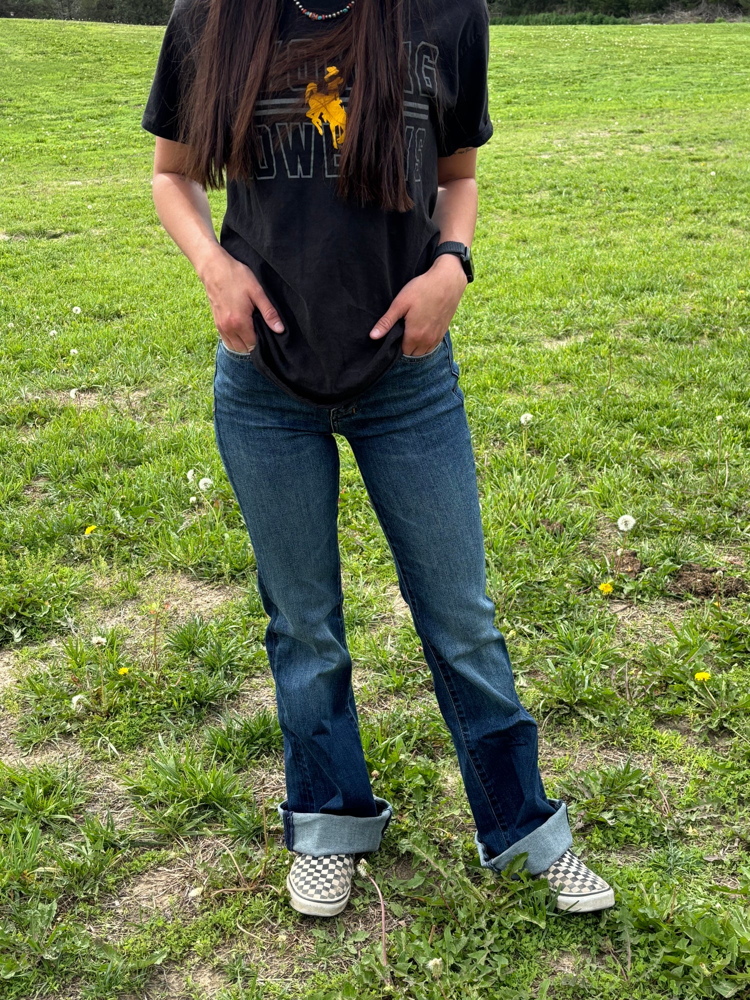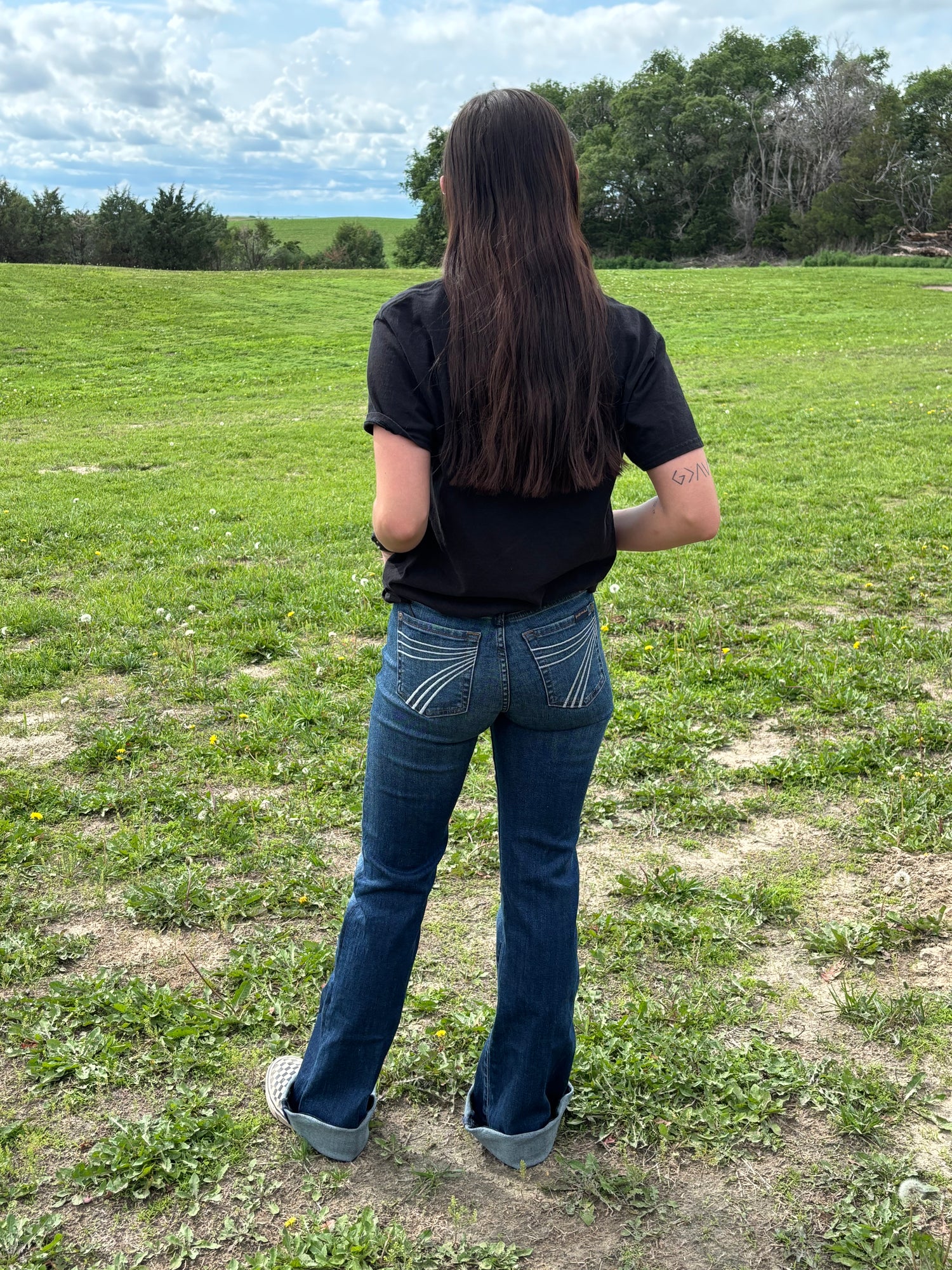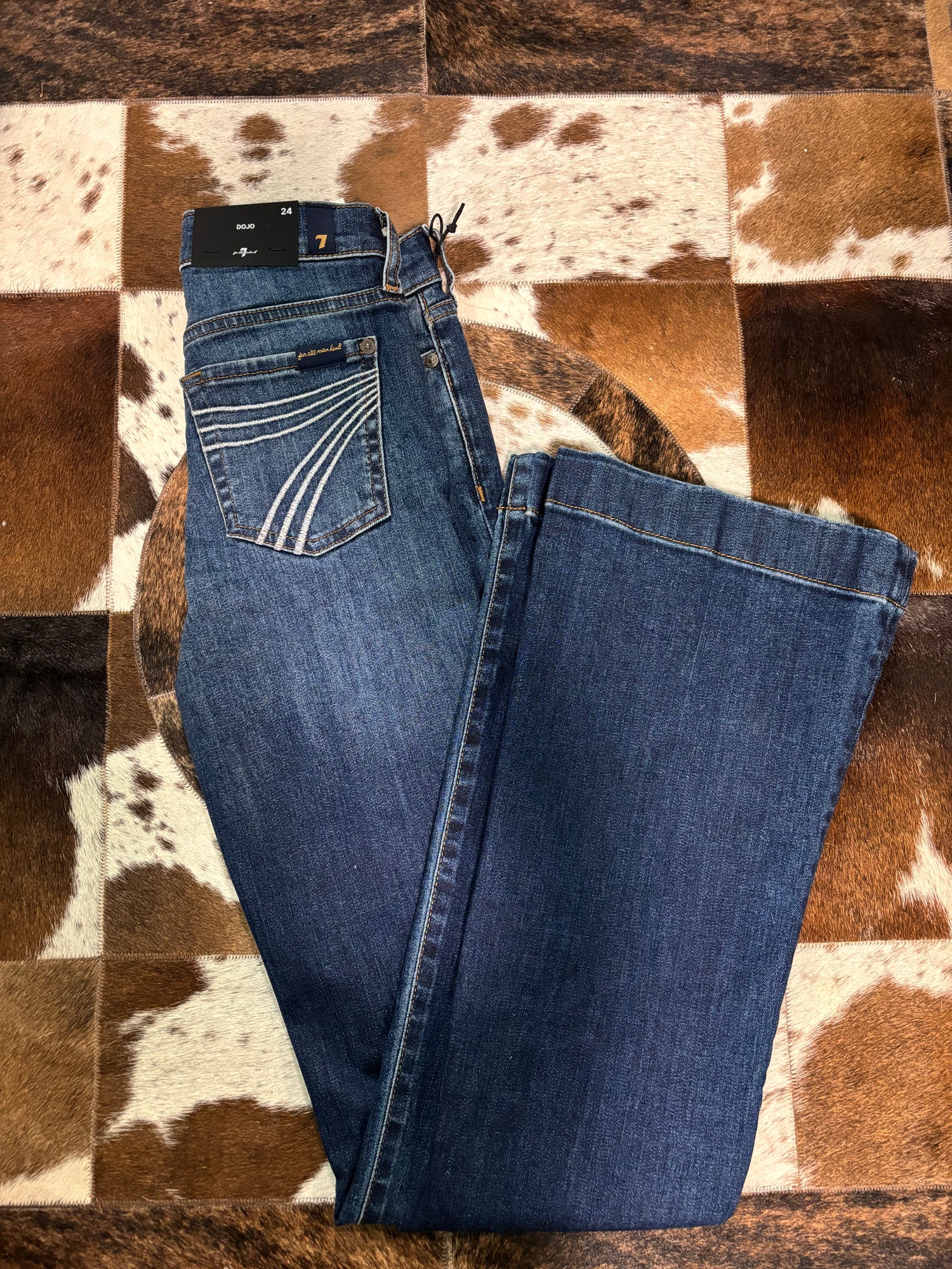 White Pocket 7FAMK Dojo Style Jeans. Stretchy, mid rise. 34in Inseam!